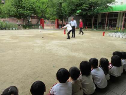 最後に先生たちの消火器訓練の様子を見て、「こんな風に火事を消すんだね」「すごーい!火を倒した!」と、興味深そうでした。