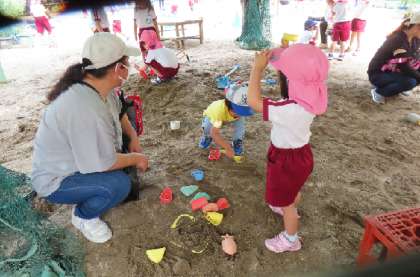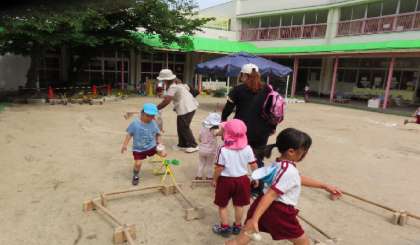 未就園児園庭開放「ひよこ」が始まりました。今日もお友達が遊びに来てくれましたよ。園児たちが、砂場のおもちゃを出したり、フープや巧技台で楽しいコースを作ったりして待っていました。しばらく遊んでいると、「迷路ができました!遊びに来てください。」という5歳児そら組の声が…。「ひよこ」の友達やお家の方も園児たちと一緒に探検です。「行き止まりもあるよ」「こっちは細い道やから気を付けてね」という声掛けを聞きながら見事にゴールにたどり着きました。