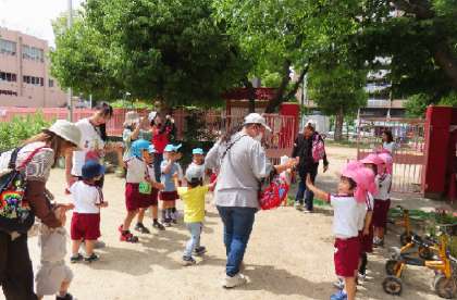最後は門の前で、みんなで「ひよこ」の友達を「また来てねー」と見送りました。