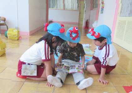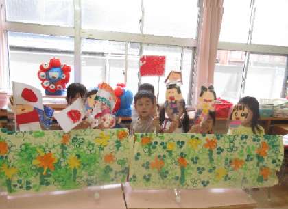 でも、お家の人と一緒につくったミャクミャク帽子をかぶって、万博ごっこを楽しんでいます。友達と万博の本を見たり、ペープサートと万国旗を持って、「万博に行ってきまーす」と動かしながら遊んだり、イメージを広げて楽しんでいます。