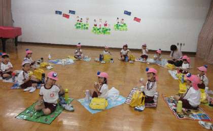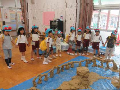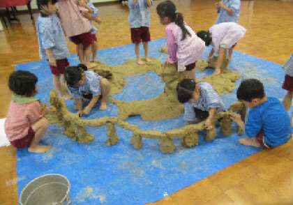 なんと、土粘土で、大阪関西万博の大屋根リングを建設中!「大阪九条万博」に出かけて、遠足ごっこです。4歳児はな組にも、「大屋根リングできたよ。見てね」と知らせたので、はな組は、遊戯室の大屋根リングの横で、シートを広げて、おいしいおにぎり弁当を食べました。