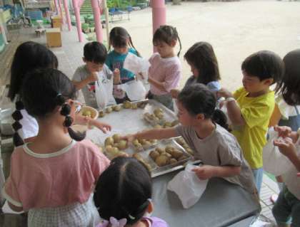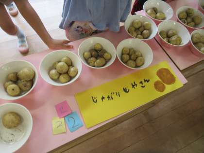 先日、収穫したたくさんのジャガイモ。「はな組さんにも分けてあげよう」と5歳児そら組が、張り切っています。相談の結果、『ジャガイモ屋さん』をすることになりました。