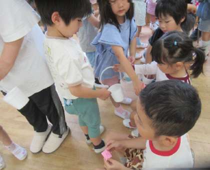 そら組のみんなが買い物をしてから、カゴにチケットを3枚ずつ入れて、はな組に誘いに行きました。
