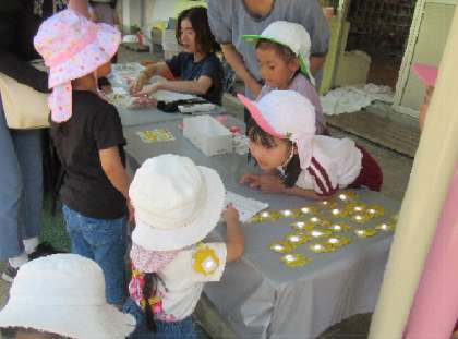 5歳児そら組が、数日前から、「ひよこちゃんたちが来たら、触らせてあげよう」と、花びら入りの氷をつくっていたので、受付を済ませた子から、「触ってみ!冷たいよ!」と触らせにいっていました。