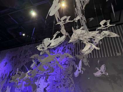 頭上に大きな飾りがあり、「紙?」「切り紙かな」「すごねー」と言いながら見上げていました。