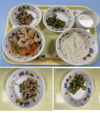 3日(木)… けいにくとひとくちがんものにもの オクラのうめふうみ ツナっぱいため ごはん ぎゅうにゅう