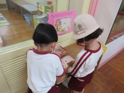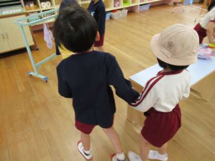 大きい組が登園してきた小さい組に、朝の用意を手伝ってくれました。