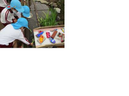 自分でつくった石の金魚を、水が流れる水路に飾ってもらい、とても満足気でした。