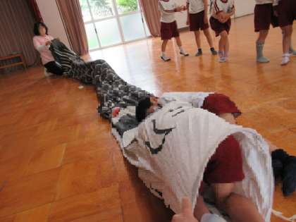 室内では、小さい組の時を思い出して、風になってこいのぼりのおなかを通り過ぎて遊びました。