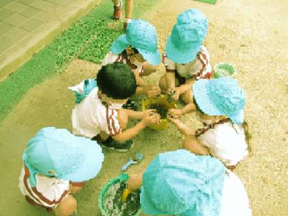 バケツにスコップなど、いろんな道具を持ってきて、園庭のある場所で何やら行っている5歳児そら組。水を汲んできて、泥団子づくりが始まりました!(^^)!