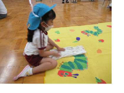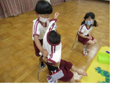 2回目の年少組の体重測定。大きい組の子どもたちの手伝いも、どんどん年長児らしくなってきました。服の畳み方を見せたり、服を着るのを手伝ったり、シールを貼る個所を教えたりするなど、自分なりに考えながら、優しく接しています。小さい組の子どもたちに「ありがとう」と言ってもらって、とても嬉しそうでした。