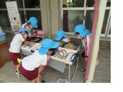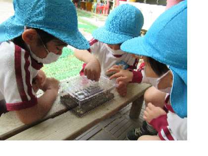 ダンゴムシに親しみ、たくさん見つけたり、落ち葉やブロッコリーの葉など、餌をあげたりしています。ダンゴムシの遊び場をつくろうと、箱やボール紙などを使って、ダンゴムシ迷路をつくり始めました。「ここは狭すぎるから通られへん」「滑り台もつくろう」と、工夫しながら取り組んでいます。「ダンゴムシさん、歩いてる!うれしそうやな」「このダンゴムシ、近道してるで」と、観察しながら楽しみました。