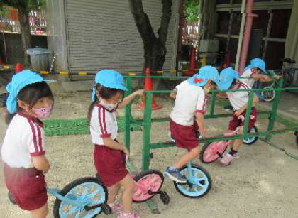 一輪車にもチャレンジ!サドルにお尻を乗せるまでがまず難しく、何度も何度も取り組んでいました。