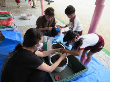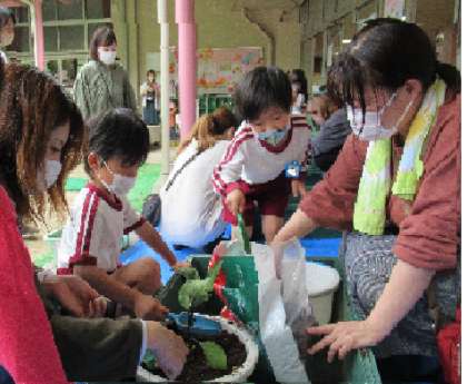 ゴロゴロした底石の感触を楽しんだり、土がフワフワになるように植木鉢に入れたり、苗が折れないように優しく丁寧に扱ったりする姿が見られました。