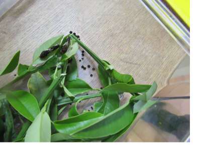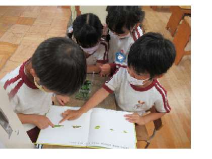 絵本を見ながら、どんなチョウになるのか調べたり、ムシャムシャ葉っぱを食べているところをじっくりと見たり、アオムシの大きさによってウンチの大きさが違うことに気付いたり、触ったらフワフワ柔らかいことを発見したりしていました。