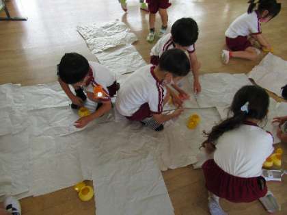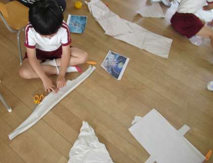 その後、大きな紙を切ったり、つなげたりして、みんなでジンベイザメをつくったり、一人で、または友達と、イルカやタカアシガニやハリセンボンなどをつくったりして、見せ合いました。そら組の部屋が海遊館になりました!