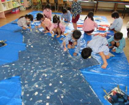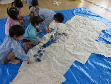 昨日つくったジンベイザメたちに、絵の具とローラーとタンポで、色や模様をつけました。