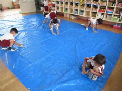 海遊館で、ダイバーさんが潜ってアザラシの水槽を掃除している様子を見たので、「潜って掃除だ!」と、シートの海に飛び込んで、雑巾でゴシゴシ。片付けも大事な遊びの一つです。