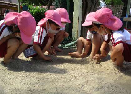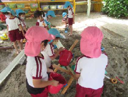 4歳児はな組は、「足のかくれんぼ!」と、砂をかけて、自分の足が隠れるのが面白く、繰り返し楽しんでいました。