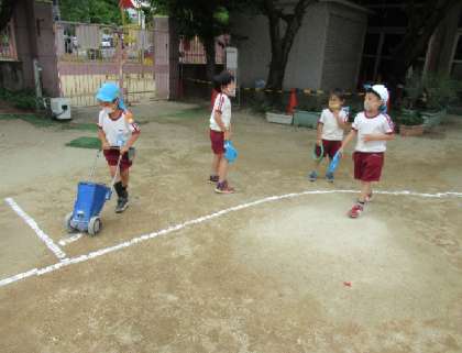 5歳児そら組が自分たちで白線でトラックをかいて、リレーをしています。