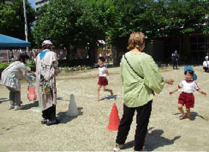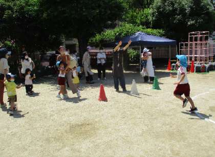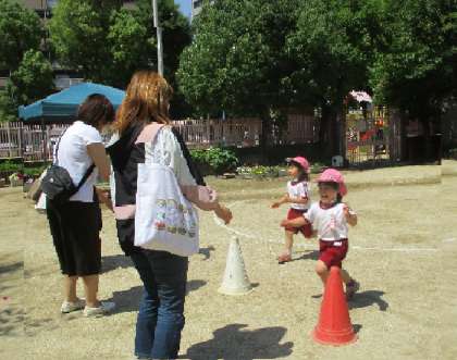 かけっこは、今日のゴールはお家の方です!ゴールで腕を広げて待ってくれているお家の方に向かってダッシュ!抱きとめてもらって、「速かったね」と、声をかけてもらって大満足!