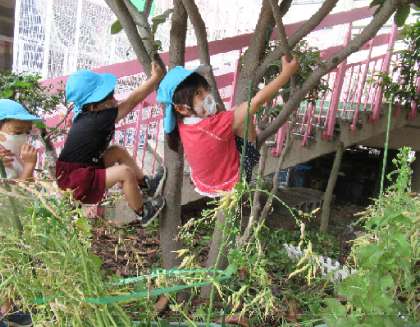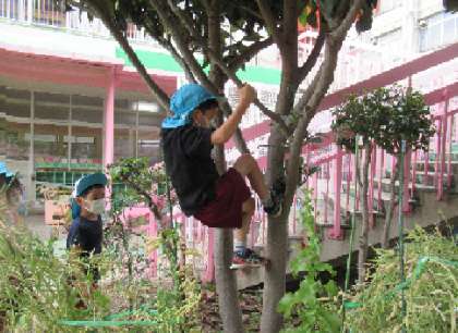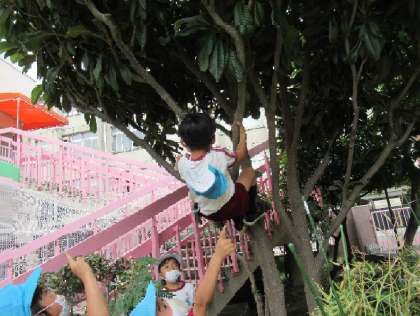 5歳児そら組で、「どうやって採る?」「木に登って採る!」ということで、さっそく登ってみました。