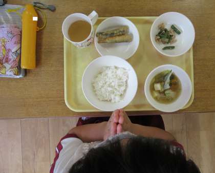 今日のメニューは、「いわしのてんぷら、五目汁、豚肉とさんどまめのいためもの」
