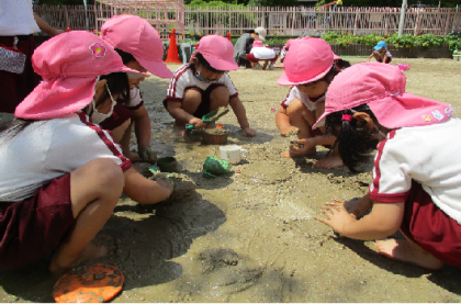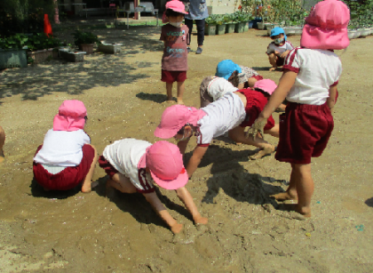 子どもたちは、思わず足や手を大きく動かしたり、ペタペタと手やスコップで鍋やバケツに集めたりし始めました。