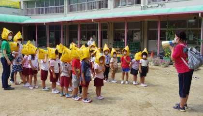 まず、机、椅子の下に入るなどして身を守り、先生の話をよく聞いて、指示があれば上靴のまま外に避難します。4歳児はな組は、はじめて防災頭巾をかぶって行動しました。