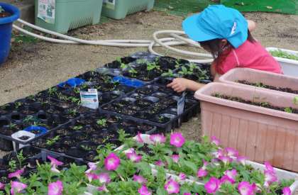 近づいてみると、先日種をまき、小さな芽が出てきたオジギソウを、そっとつついていました。「この小さい丸い下の葉っぱじゃなくて上のほう、チョンってするねん」と教えてくれました。