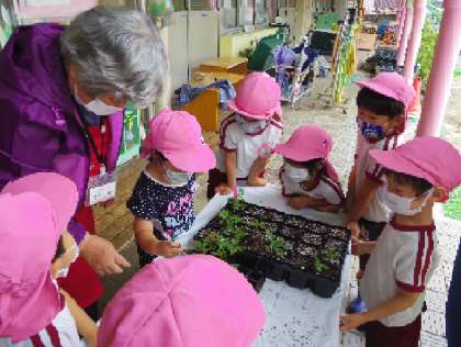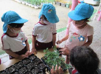 1回目にマリーゴールドの種をまいて、少し大きくなった苗を、少し大きいポットに植え替えます。まずは、木の棒で土をグリグリとして穴を開け、次にピンセットで苗を土ごとつまんで、お引越しです。教えてもらいながら、何回かするうちに、だんだん慣れて上手になってきました。大きくなるように、『花のごはん』の肥料も入れました。