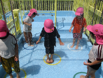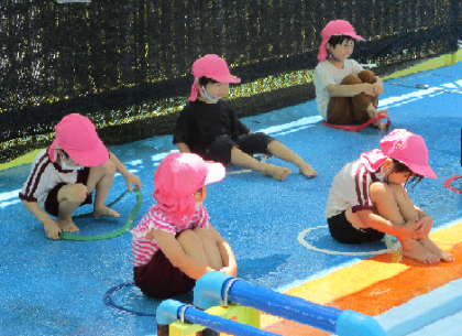 「プールで何して遊ぼうかな?」「浮き輪で遊ぼう!」「い〜ぱい水入れたいね」など、子どもたちはプール遊びを楽しみにしています。