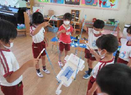 海遊館で見た魚を、いろいろな素材でつくっています。たくさんできてきた先日、「魚釣りたいから、棒と糸がほしい」と,魚釣りが始まりました。「魚、釣られへんわ」「なんでやろ」「エサがないからちゃう?」など、考えたり友達と相談したりしました。糸の先を丸く結んでみたり、先に洗濯ばさみを付けてみたり、試行錯誤した結果、マグネットを付けました。