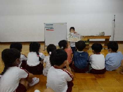 また、熱中症はどんなときになるのか、熱中症の症状はどのようなものか、熱中症になったらどうしたらよいか、熱中症にならないためにどうすればよいかについて、絵本を使って話をしました。