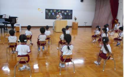 始業式では、園長先生とウサギのみみちゃんと、『進んで挨拶をしよう』『やってみようと思ったことを、最後まであきらめずに取り組もう』という約束をしました。