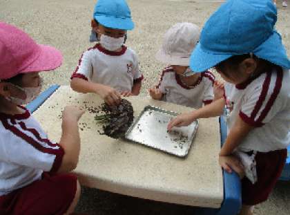 びっしりと詰まった種を取りながら、「トゲトゲが痛いな」、「びっしりやから取りにくい」、「めっちゃいっぱいあるな。数えてみようか」と、話していました。