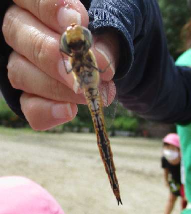 「あそこにいる!」「次はこっち!」「まてまてぇ〜」。何度も見つけては追いかけますが、トンボはとても早く飛んでいきます。なかなか捕まえることができません。少し応援して、教師が捕まえました。