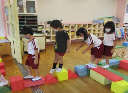 「ここは、長い積み木置こう」「こっちは、三角がいいね」「四角の積み木も置くわ」と、言いながら積み木をつなげていきます。