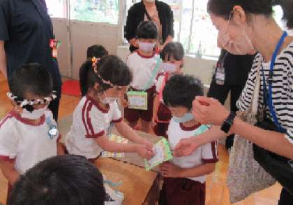 『ボタンおとし』は、水の中の器にボタンが何個入るか、ドキドキしながら落として遊びました。うまく器に入ったら、お家に方や当番のお店の方にも「はいったー」と言ってもらって、うれしかったね。