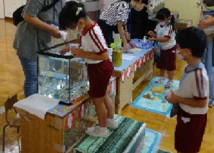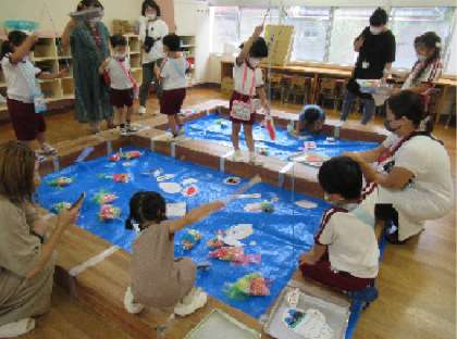 『魚つり』では、5歳児が受付で、シールを貼ったり、釣り竿や釣った魚を入れるトレーを渡したり、お客さんがたくさん釣った魚を最後にリリースしたりと大忙し。