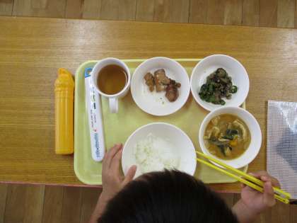昼食事業では、バランスのよい食事をいただくとともに、旬の食材に興味や関心をもつことも大切にしています。今回、幼稚園で、自分たちが栽培、収穫した野菜が含まれていたので、「〇〇ちゃんのナスだね」「ピーマンも入ってる」「キュウリも!」と、話す姿があったようです。