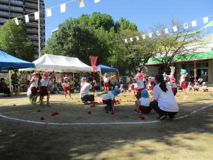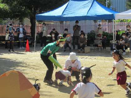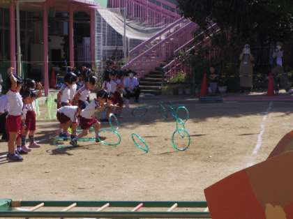 運動会2 公開日 2022/10/13 更新日 2022/10/13 子どもたちの様子 はな組のリズムでは、はな組の子どもたちダンゴムシが、楽しく遊んでいると、雨が降ってきたり、こわーいカマキリが現れたりしました。でも、すぐに小さく丸くなったり、サッと隠れたりしたので大丈夫でした。よかったね。 ダンシング玉入れは、音楽や合図をよく聞いて、かごに向かって手を思い切り伸ばして投げたり、ジャンプをしたり…、よーくねらって投げていました。入ったかな。 いいね(0)