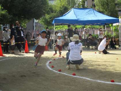お家のみなさんも、4歳児はな組の子どもたちも、会場全体が熱い思いで見守り、応援する中、真剣な表情で、バトンを握りしめて、次の友達へ渡そうと力いっぱい走っていました。