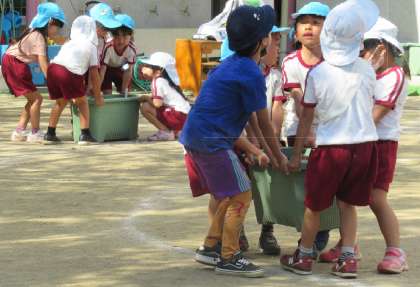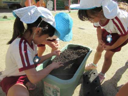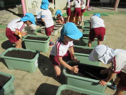 夏野菜を収穫した後の土を、子どもたちがふるいにかけ、肥料等をまぜた土に種を蒔きました。水菜、大根、カブ。芽が出てくるのが楽しみです。