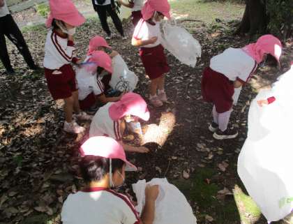 その後、はな組は公園内の日本庭園で、ドングリ拾いを存分に楽しみました。「ドングリの帽子があったよ」「緑のドングリさんがいる!」など、ドングリの色や形の違いにも気付いていました。
