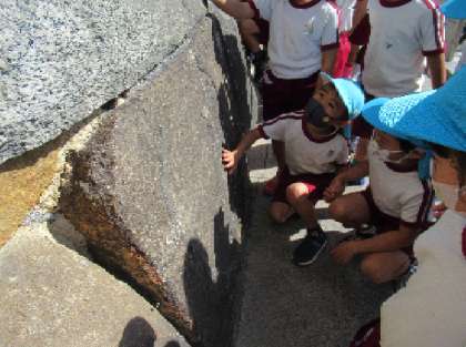公園内のあちこちの石に、いろいろなマークが彫られていることを知り、天守閣からおりると、さっそく丸い印が彫られているのを発見!子どもの観察力はすごいですね。