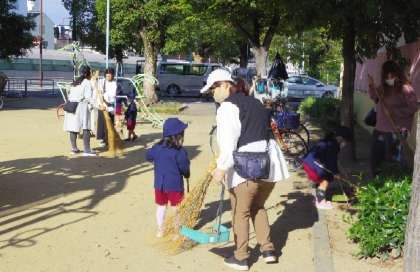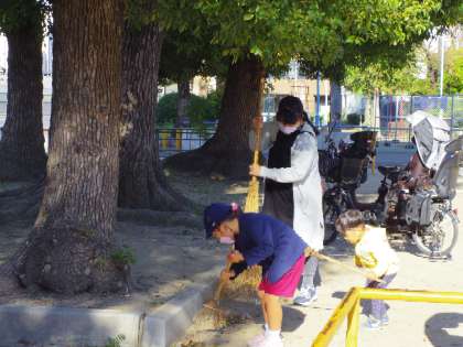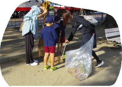 いつも登降園時に使っている幼稚園前の公園を、4歳児はな組の子どもたちが、今朝、保護者と一緒に掃除しました。