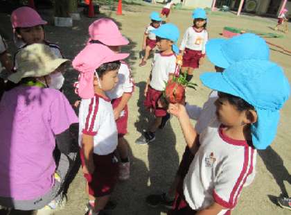 園庭のザクロが赤く実り、パカッと割れました。中にはきれいな実がびっしり!
