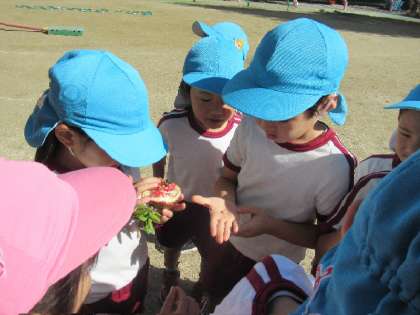 一粒ずつとって、「キラキラしてる」「中に歯みたいなのが入ってる」「いいにおいがするよ」といろいろな感想を口にしていました。どんな味がするのかな?