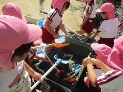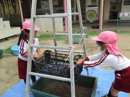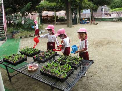 種を蒔き、芽が出て、少しずつ大きくなっていく様子を見ながら、興味や関心を深めています。大きくなって花が咲くのが楽しみです。